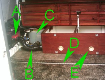 | B - Air ducting tube from Propex gas space heater under drivers seat. This feeds warm air along the 'bed box' (clothes storage area under main bed) and continues down the van to the shower/toilet pod. Behind this ducting sits the Whale water pump which maintains a pressurised system |